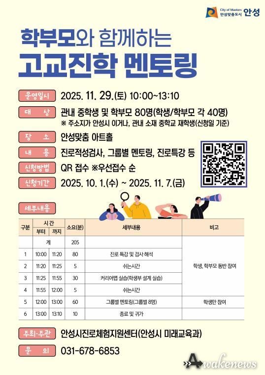어웨이크뉴스 오경하 기자 | 안성시는 오는 11월 29일 오전 10시, 안성맞춤 아트홀에서 관내 중학생과 학부모를 대상으로 ‘학부모와 함께하는 고교진학 멘토링’을 실시한다고 밝혔다.