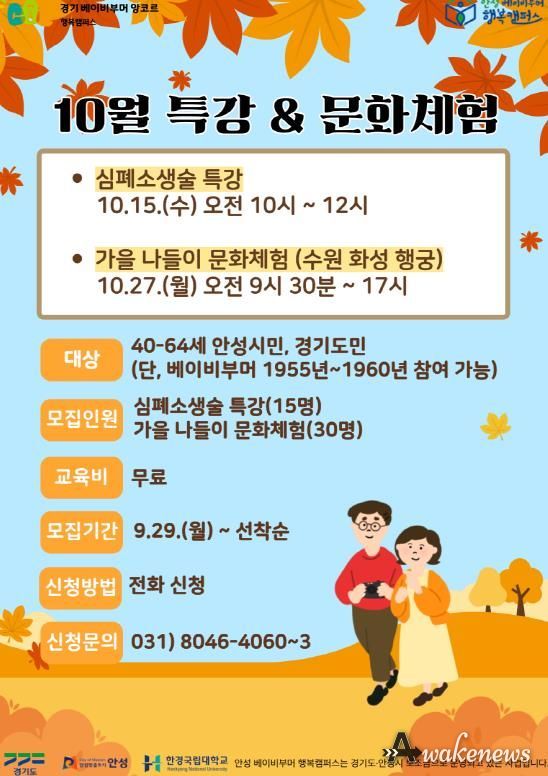 어웨이크뉴스 오경하 기자 | 안성 베이비부머 행복캠퍼스(한경국립대학교 평생교육원)는 오는 10월 15일부터 27일까지 중장년 안성시민(경기도민)을 대상으로 ‘10월 특강(심폐소생술) 및 문화체험(수원화성행궁)’ 프로그램을 운영한다고 밝혔다.