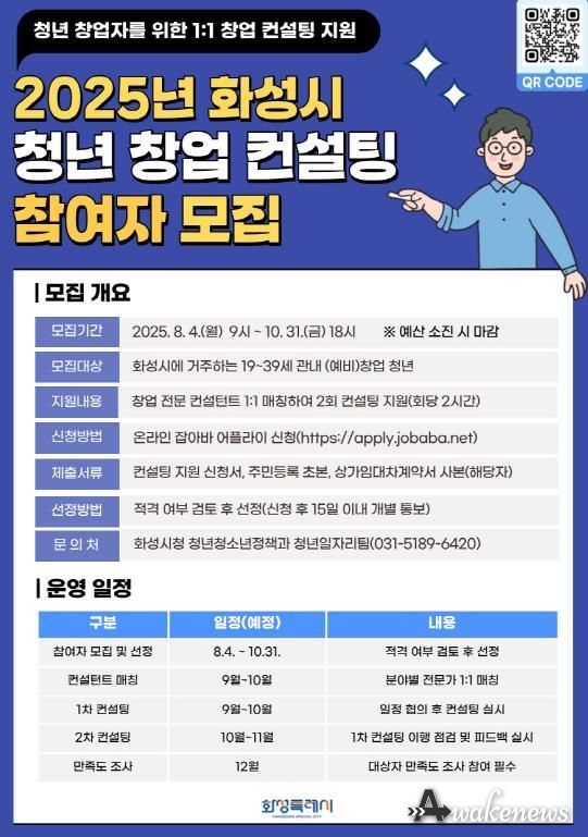 어웨이크뉴스 오경하 기자 | 화성특례시가 오는 31일까지 ‘2025년 청년 창업 컨설팅 지원사업’ 참여자를 모집한다.