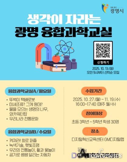 어웨이크뉴스 오경하 기자 | 광명시는 오는 10월 27일부터 11월 19일까지 초등학교 3~5학년을 대상으로 ‘생각이 자라는 광명 융합과학교실’ 시범수업을 운영한다.