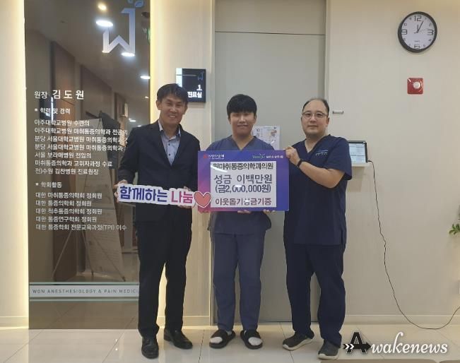 어웨이크뉴스 오경하 기자 | 양주시 양주2동이 지난 1일 관내 원마취통증의학과의원에서 추석을 맞이하여 이웃돕기 성금 200만 원을 양주2동에 기탁했다고 밝혔다.