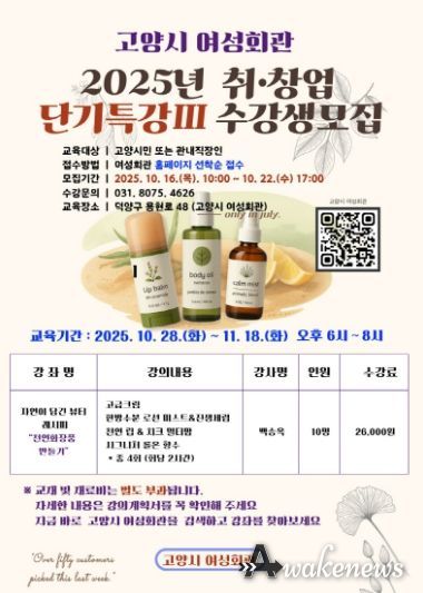 어웨이크뉴스 오경하 기자 | 고양특례시 여성회관에서는 친환경과 건강을 중시하는 최신 트렌드를 반영한‘취창업 단기특강Ⅲ’수강생을 모집한다.