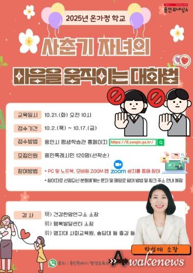 어웨이크뉴스 오경하 기자 | 용인특례시는 ‘사춘기 자녀 마음을 움직이는 대화법’을 주제로 한 ‘2025년 온가정 학교’ 온라인 특강 참가자를 모집한다고 2일 밝혔다.