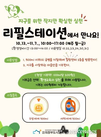 어웨이크뉴스 오경하 기자 | (재)의정부도시교육재단은 10월 13일부터 11월 7일까지 매주 월요일부터 금요일, 오전 10시부터 오후 5시까지 힐링센터 2층에서 생활 속 친환경 실천 활동 ‘리필스테이션’을 운영한다.