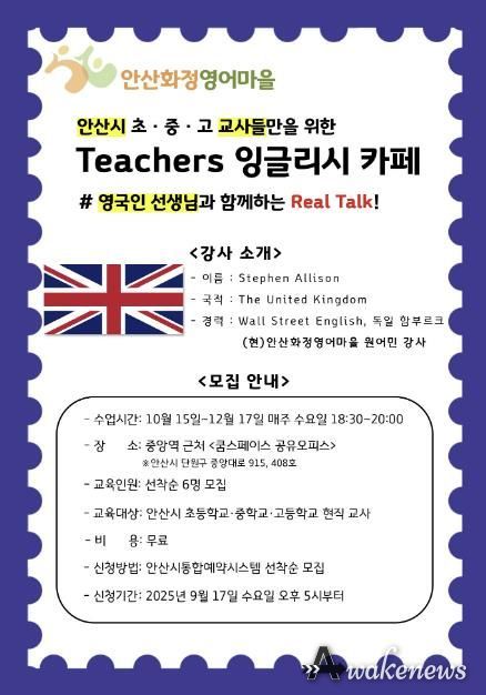 어웨이크뉴스 오경하 기자 | 안산시 안산화정영어마을은 오는 15일부터 12월 17일까지 관내 소속 교사를 대상으로 ‘티처스(Teachers) 잉글리시 카페’를 운영한다고 10일 밝혔다.