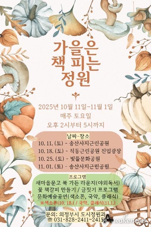 이와 함께 시는 10월 11일부터 11월 1일 매주 토요일 오후 2시부터 5시까지 총 4회에 걸쳐 송산사지 근린공원, 직동 진입광장, 빛뜰문화공원에서 ‘가을은 책피는 정원’ 행사를 순회 개최한다. 새마을 이동도서관과 협업해 도서 대여와 어린이 글짓기 교실을 열고, 지역 음악인들과 함께하는 클래식‧국악‧색소폰 공연, 꽃 책갈피 만들기 체험 프로그램도 진행할 예정이다.