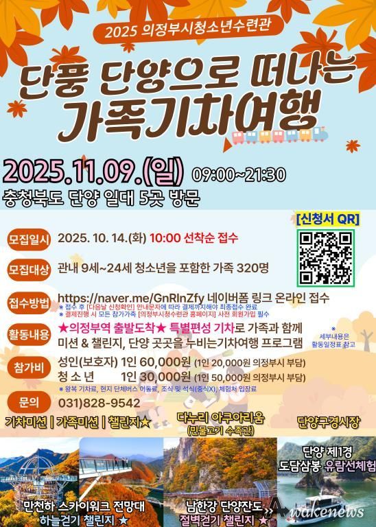 이번 행사는 단풍철 성수기를 맞아 의정부역에서 단양역까지 왕복 특별 기차편을 마련했으며, 도담삼봉·단양잔도·만천하 스카이워크 전망대·다누리 아쿠아리움·구경시장 등 단양의 대표 명소를 탐방한다. 참가 가족은 두 팀으로 나뉘어 순환형 일정으로 운영되며, 현장에서 미션 · 챌린지 활동이 함께 진행되어 여행의 재미를 더할 예정이다.