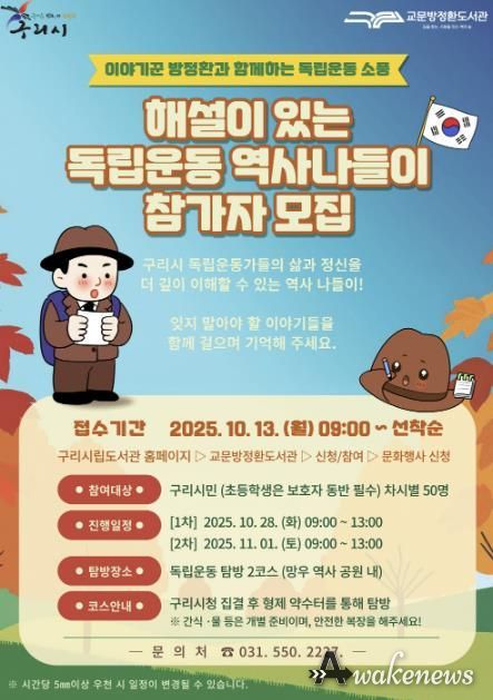 어웨이크뉴스 오경하 기자 | 구리시는 오는 10월 13일부터 27일까지 교문 방정환 도서관에서 진행하는 ‘해설이 있는 독립운동 역사 나들이’ 프로그램의 참여자를 모집한다고 밝혔다.
