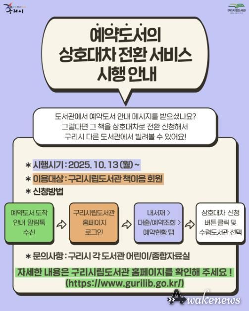 어웨이크뉴스 오경하 기자 | 구리시는 오는 10월 13일부터 시민들의 도서 이용 편의성을 높이기 위해‘시립도서관 예약 도서 상호대차 전환 서비스’를 새롭게 운영한다고 밝혔다.