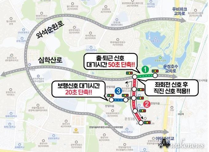 어웨이크뉴스 오경하 기자 | 파주시는 출퇴근 시간대에 신호주기가 길어 불편했던 운정 한빛마을 5단지 및 2·5단지 소도로 일대 구간의 신호체계를 우선적으로 개선했다고 밝혔다.