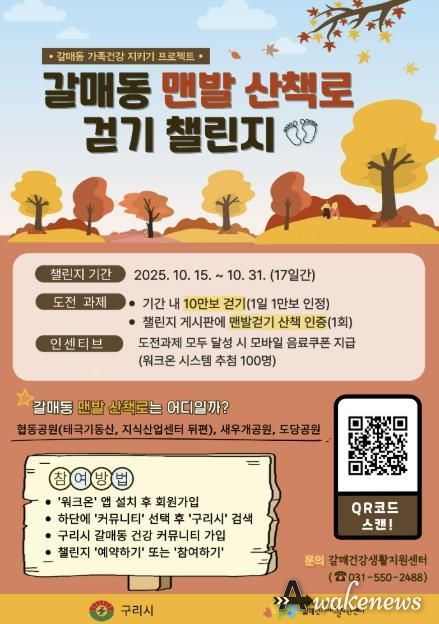 어웨이크뉴스 오경하 기자 | 구리시는 가을철 주민들의 건강한 생활 습관 형성과 스트레스 완화를 위해 ‘갈매동 맨발 산책로 걷기 챌린지’를 오는 10월 15일부터 31일까지 17일간 운영한다고 밝혔다.