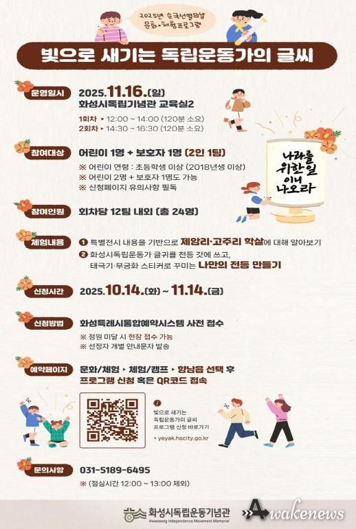 어웨이크뉴스 오경하 기자 | 화성특례시가 11월 16일 화성시독립운동기념관에서 화성지역 순국선열들의 숭고한 희생과 화성시독립운동사의 가치를 전승하기 위한 ‘순국선열의 날 문화·체험 프로그램’을 운영한다.
