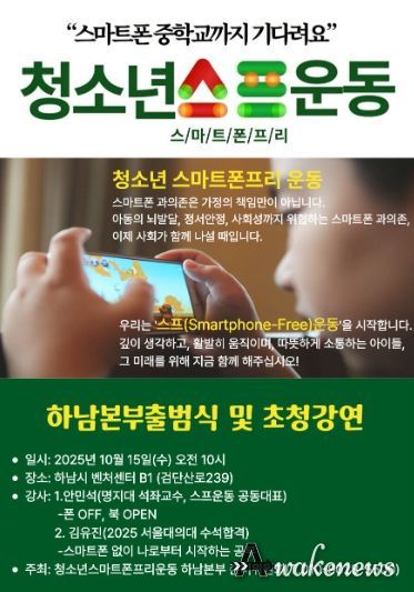 어웨이크뉴스 오경하 기자 | 15일 오전 10시, 하남시 벤처센터에서 ‘청소년 스마트폰 프리 운동(Smartphone-Free)’ 하남본부 출범식을 갖는다.