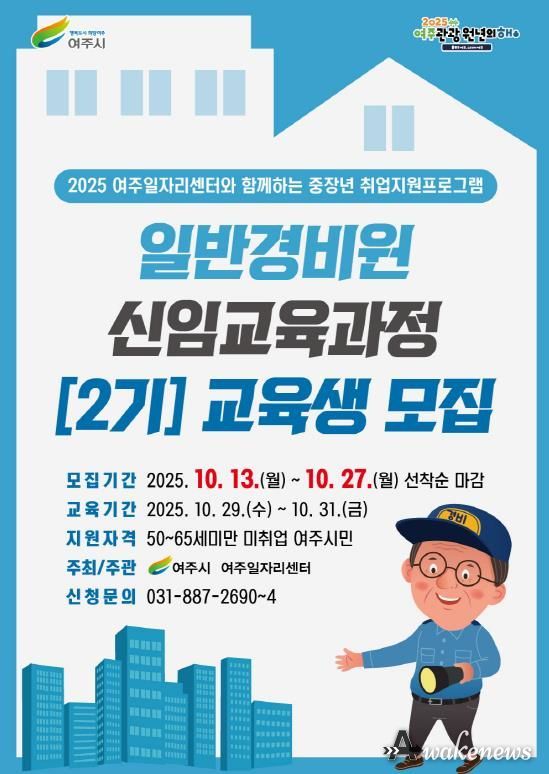 어웨이크뉴스 오경하 기자 | 여주시는 10월 13일부터 10월 27일까지 베이비부머(중장년) 취업지원을 위한 ‘2025년 일반경비원 신임교육과정 2기 교육생’을 모집한다.