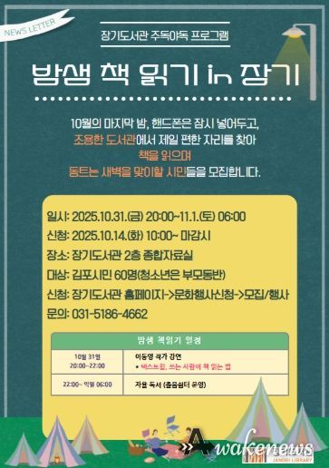 어웨이크뉴스 오경하 기자 | 김포시 장기도서관은 주독야독 프로그램인 '밤샘 책 읽기 인(in) 장기'를 10월 31일 오후 8시부터 11월 1일 오전 6시까지 장기도서관에서 진행한다고 밝혔다.