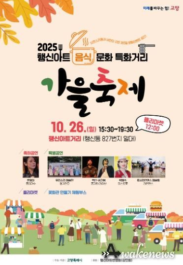 어웨이크뉴스 오경하 기자 | 고양특례시는 오는 26일 오후 3시 30분부터 오후 7시 30분까지 ‘행신아트 음식문화 특화거리 가을축제’를 행신아트거리 일대에서 개최한다고 밝혔다.