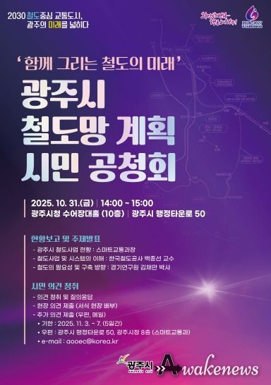 어웨이크뉴스 오경하 기자 | 광주시는 오는 31일 오후 2시, 광주시청 수어장대홀(10층)에서 ‘함께 그리는 철도의 미래’를 주제로 광주시 철도망 계획 시민 공청회를 개최한다.