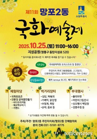 어웨이크뉴스 오경하 기자 | 수원시 영통구 망포2동 주민자치회는 오는 10월 25일, 영통구 지성공원에서 제11회 국화예술제를 개최한다. 태장동부터 이어져온 이번 축제는 지역주민이 함께 어울리고 즐길 수 있는 참여형 문화행사로 국화포토존, 친환경 공예품만들기 체험부스, 먹거리 장터, 플리마켓 등 다채로운 프로그램이 마련될 예정이다.