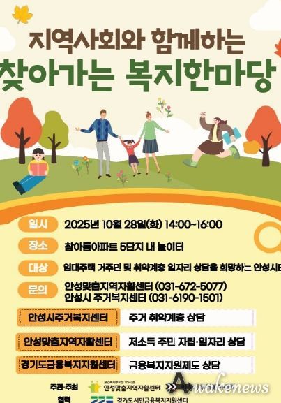 어웨이크뉴스 오경하 기자 | 안성시는 오는 10월 28일 오후 2시부터 4시까지 참아름아파트 5단지 내에서 ‘지역사회와 함께하는 찾아가는 복지 한마당’을 열고, 시민들을 대상으로 찾아가는 주거복지 이동상담소를 운영한다.