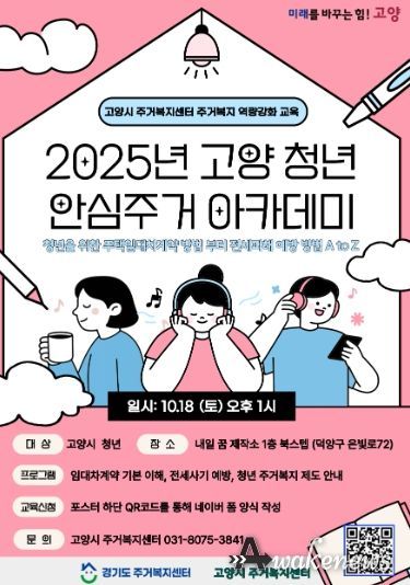어웨이크뉴스 오경하 기자 | 고양특례시는 청년층의 안정적인 주거생활을 지원하기 위해 오는 10월 18일 13시 내일꿈제작소(덕양구 은빛로 72)에서 ‘2025 고양청년 안심주거 아카데미’를 개최한다고 밝혔다.