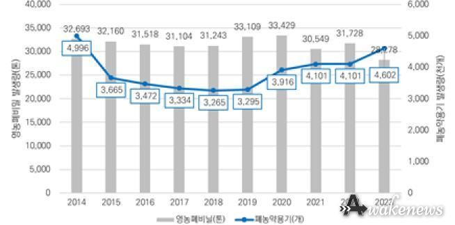 2023년 기준 경기도 영농폐기물 발생량은 영농 폐비닐이 약 3만 톤(93%), 폐농약 용기가 약 460만 개(94%)로 나타났다.
