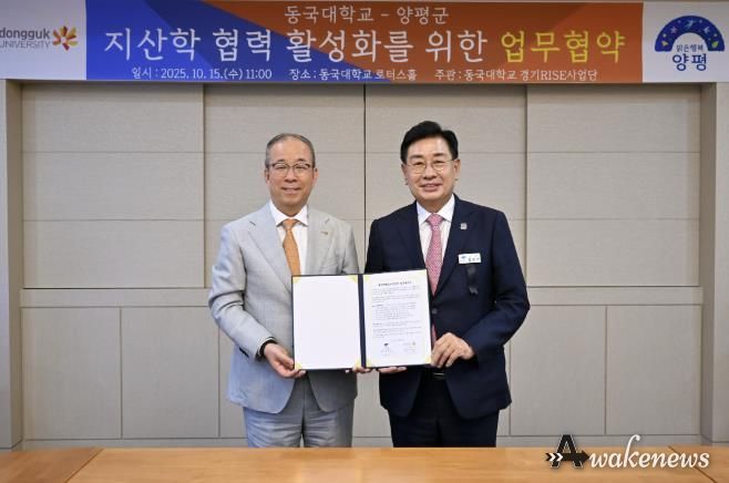 어웨이크뉴스 오경하 기자 | 양평군과 동국대학교는 15일, 서울 동국대학교 본관 4층 로터스홀에서 교류 협력 및 공동사업 기반 조성을 위한 업무협약(MOU)을 체결했다.