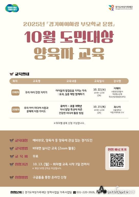 한편 이번 교육은 재단이 경기도 위탁으로 운영하는 ‘2025년 경기아이사랑부모학교’ 사업의 하나로 마련됐다. ‘경기아이사랑부모학교’는 경기도가 건강한 양육 문화 확산을 목표로 도민에게 체계적인 양육자 교육과 1:1 맞춤형 양육상담을 제공하는 사업이다.