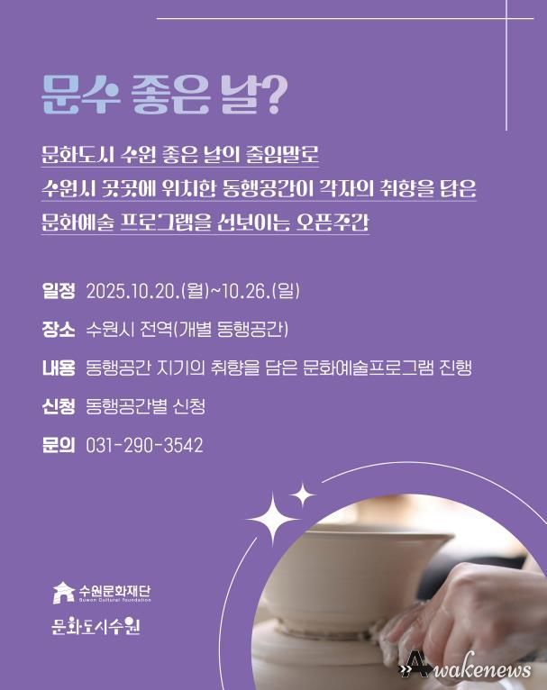 어웨이크뉴스 오경하 기자 | 수원문화재단이 오는 20일부터 26일까지 ‘동행공간’ 특별 주간인 ‘문수 좋은 날’을 운영한다.