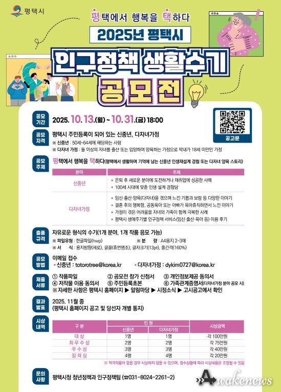 어웨이크뉴스 오경하 기자 | 평택시는 2025년 평택시 인구정책 생활수기 공모전 ‘평택에서 행복을 택하다’를 오는 10월 31일까지 개최한다고 밝혔다.