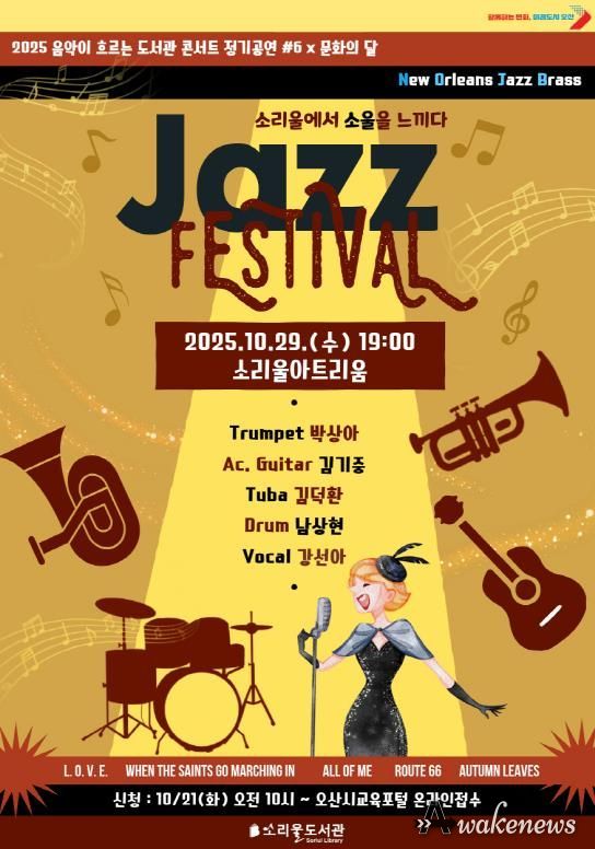 어웨이크뉴스 오경하 기자 | 경기도 오산시는 오는 10월 29일 오후 7시, 소리울도서관 3층 소리울아트리움에서 '2025 음악이 흐르는 도서관 콘서트 정기공연 #6 × 문화의 달 – Jazz Festival; 소리울에서 소울을 느끼다'를 개최한다고 밝혔다.