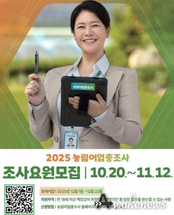 어웨이크뉴스 오경하 기자 | 평택시가 10월 20일부터 11월 12일까지 ‘2025 농림어업총조사’ 조사요원을 모집한다.