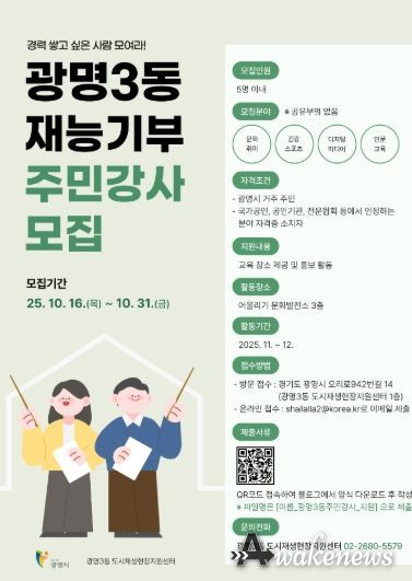 어웨이크뉴스 오경하 기자 | 광명시는 주민 재능 나눔으로 지역 공동체 활력을 높이기 위해 광명3동 어울리기 문화발전소에서 교육 프로그램을 운영할 주민 강사를 모집한다고 17일 밝혔다.
