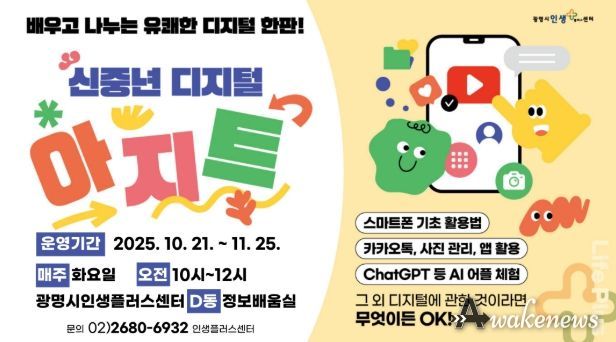 어웨이크뉴스 오경하 기자 | 광명시 인생플러스센터는 중장년층의 재능기부로 마련된 ‘신중년 디지털 아지트’를 운영해 시민들의 디지털 역량 강화를 지원한다.