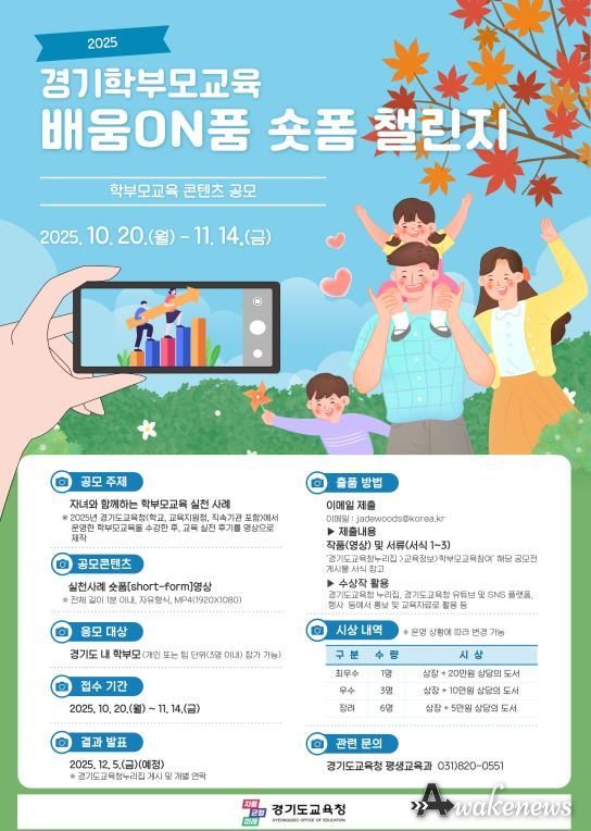 어웨이크뉴스 오경하 기자 | 경기도교육청이 학부모의 교육 참여문화 확산과 가정의 배움 문화 조성을 위한 ‘2025 경기학부모교육 콘텐츠 공모전(배움 온(ON)품 숏폼 챌린지)’을 개최한다.