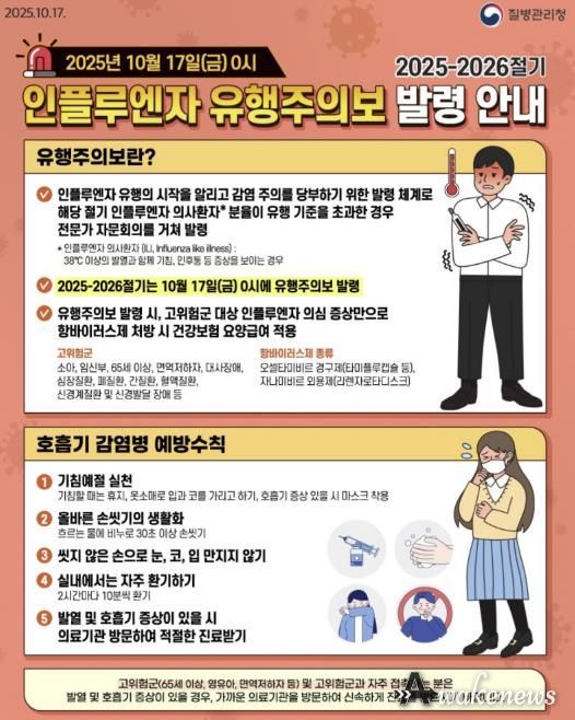 질병관리청은 인플루엔자(독감) 환자 수가 급격히 증가함에 따라, 지난 17일 0시부터 ‘인플루엔자 유행주의보’를 발령했다.