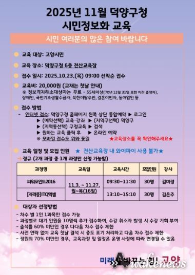 어웨이크뉴스 오경하 기자 | 고양특례시 덕양구는 고양시민을 대상으로 하는 ‘9차 시민정보화교육’ 정규과정 수강생을 오는 23일 오전 9시부터 모집한다고 밝혔다.