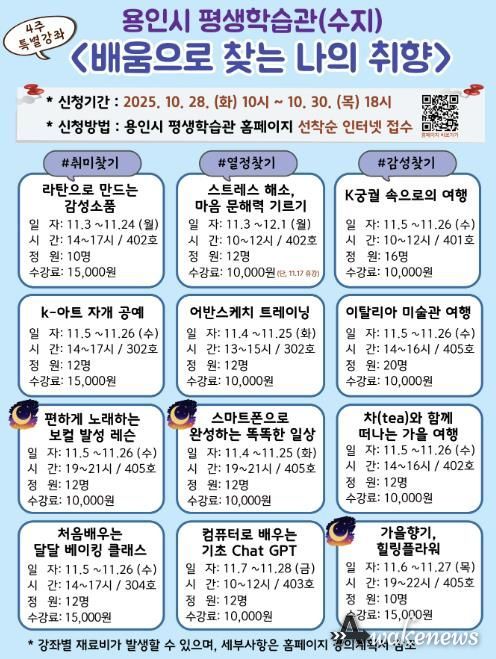 용인시 관계자는 “시민들이 배움의 즐거움을 느낄 수 있도록 실용적이고 유익한 교육 프로그램을 꾸준히 확대해 나가겠다”고 말했다.