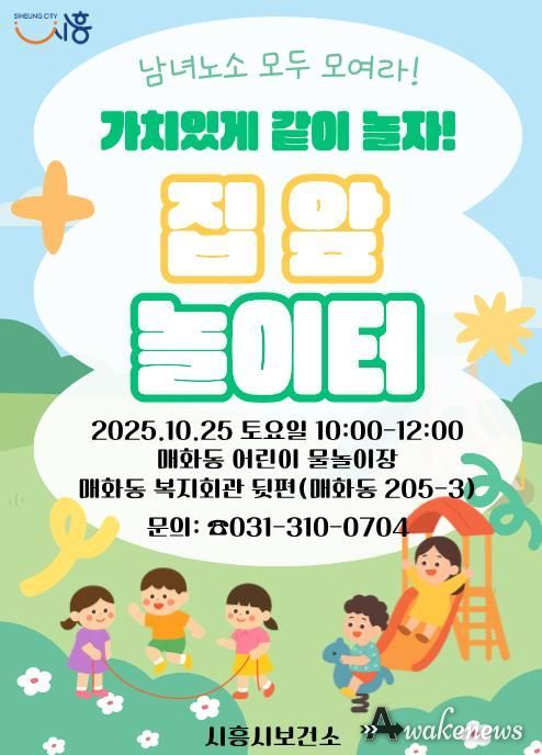 어웨이크뉴스 오경하 기자 | 시흥시는 오는 10월 25일 오전 10시부터 12시까지 매화동 어린이 물놀이장(매화동 복지회관 뒤편(매화동 205-3))에서 ‘집앞 놀이터’ 프로그램을 운영한다.