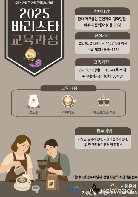 어웨이크뉴스 오경하 기자 | 가평군은 군인가족, 경력단절여성, 다문화여성 등 취업취약계층 여성을 대상으로 ‘바리스타 2급 자격증 취득과정’을 운영하며, 총 20명의 교육생을 모집한다.
