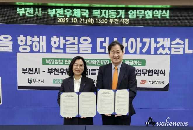 어웨이크뉴스 오경하 기자 | 부천시는 지난 21일 부천우체국과 ‘복지등기 서비스 지원’을 위한 업무협약을 맺고, 우편배송망을 활용해 복지사각지대를 발굴하고 위기가구를 지원하는 공공협력 체계를 본격적으로 가동한다.