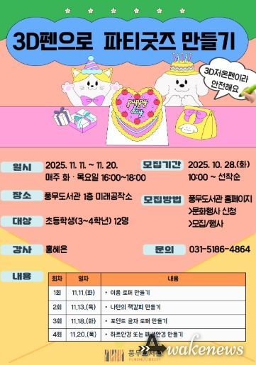 어웨이크뉴스 오경하 기자 | 김포시 풍무도서관에서는 초등학생 3~4학년을 대상으로 ‘3차원 펜으로 파티굿즈 만들기’를 오는 11월 11일부터 11월 20일까지 매주 화·목요일 오후 4시부터 6시까지 총 4회에 걸쳐 운영한다.