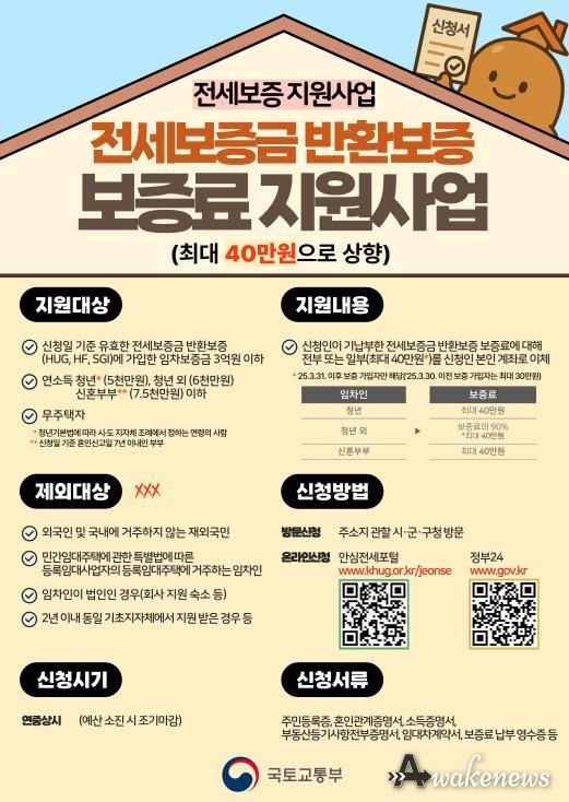 해당 사업은 주택도시보증공사(HUG)와 SGI서울보증 등의 전세보증금 반환보증 상품에 가입할 때 임차인이 납부한 보증료의 최대 40만 원을 지원하는 제도다.