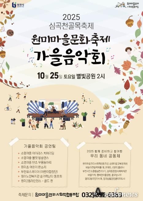 어웨이크뉴스 오경하 기자 | 부천시는 10월 25일 원미별마루와 별빛공원 일대(부천로 90번길 51)에서 ‘2025년 심곡천 골목축제–원미마을문화축제 가을 음악회’를 연다. 이번 행사는 부천시 원도심재생과가 주최하고, 원미마을관리사회적협동조합이 주관한다.