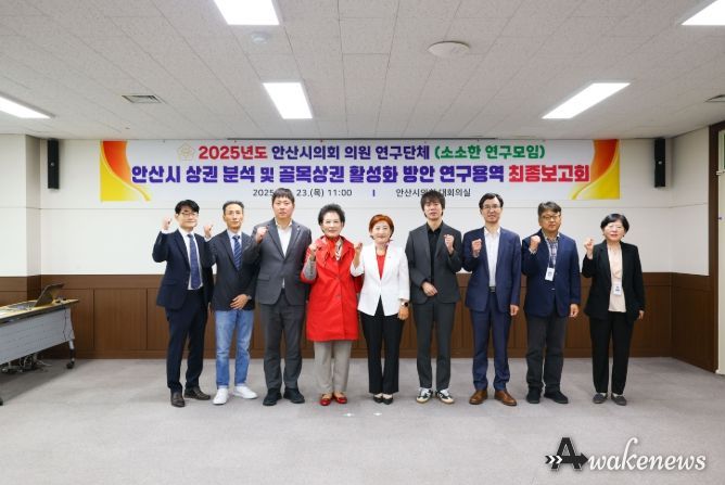 어웨이크뉴스 오경하 기자 | 안산시의회 의원연구단체 ‘소소한 연구모임(대표의원 현옥순)’이 지난 23일 의회 대회의실에서 안산 골목상권의 지속가능한 성장 방안을 모색한 연구용역 최종보고회를 개최했다. 이날 보고회에는 ‘소소한 연구모임’ 소속 현옥순 설호영 이진분 최찬규 의원을 비롯해 안산시 소상공인지원과장, 안산상권활성화재단 대표이사, 용역 연구기관 관계자 등이 참석했으며, 보고회에서는 그간 진행해온 연구 결과 공유와 실질적인 정책 반영 방안에 대한 논의가 이뤄졌다. 이번 연구용역은 지난 6월부터 약 4개월 동안 한국지역정책개발원이 수행했으며 ▲안산시 골목상권 현황 ▲주요 수요층 분석 ▲지역자원 활용 방안 ▲상인‐주민‐행정기관 간 협력 강화 방안 등을 다각적으로 검토하고 성남시 우수사례 벤치마킹 과정을 거쳐 실현가능한 ‘안산형 골목상권 발전모델’을 최종적으로 도출했다. 특히 성남시 벤치마킹을 통해 골목상권 브랜드화의 필요성을 확인한 연구단체는 ▲‘(가칭)셀렉토어 안산 오디션 조성’을 통한 로컬 브랜드 발굴 ▲ 안산시 지역화폐와의 연계 확대 ▲ 개별 골목상권 지원의 근거 마련을 위한 조례안 제정을 핵심 과제로 제