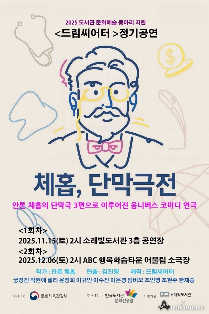▲시흥시, 소래빛도서관을 무대로 한 연극 「체홉, 단막극전」 어웨이크뉴스 오경하 기자 | 시흥시 소래빛도서관을 무대로 한 연극 「체홉, 단막극전」이 오는 11월 시민들을 찾아온다. 문화체육관광부의 2025년 ‘도서관 문화예술 동아리 지원’ 사업의 일환으로 진행되는 이번 연극은 소래빛도서관의 연극동아리 ‘드림씨어터’가 지난 1년간 준비해 온 노력이 결실을 보는 자리다. 공연은 11월 15일 소래빛도서관 3층 공연장에서 열린다. 공연명에서 알 수 있듯이, 러시아의 대표 극작가 안톤 체홉의 단막극 「재채기」, 「의지할 곳 없는 신세」, 「청혼」 등 총 3편으로 이뤄진 옴니버스 형식의 코미디 연극이 무대에 오른다. 특히 모든 연령대가 관람할 수 있는 작품으로 구성돼 더 의미 있는 무대가 될 예정이다. 이번 연극을 무대에 올리는 ‘드림씨어터’는 연극에 대한 진심과 열정으로 뭉친 시민예술인 중심의 소래빛도서관의 연극동아리다. 그동안 여러 공연을 성공적으로 선보이며 지역 문화예술 활성화에 기여해 왔으며, 이번 작품 역시 시민들의 참여와 열정으로 완성된 공연으로 기대를 모은다. 김혜순 시흥시소래빛도서관장은 “도서관이 책을 읽는 공간을 넘어, 시민이 문화를 향유하고 창작하는