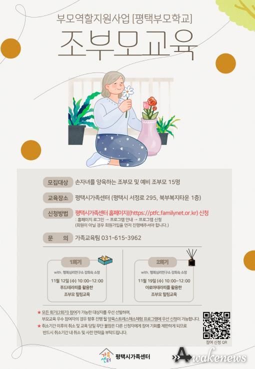 어웨이크뉴스 오경하 기자 | 평택시가족센터는 부모역할지원사업[평택부모학교]의 하나로 손주를 양육하는 조부모 및 예비 조부모를 대상으로 ‘조부모 교육’을 운영한다.