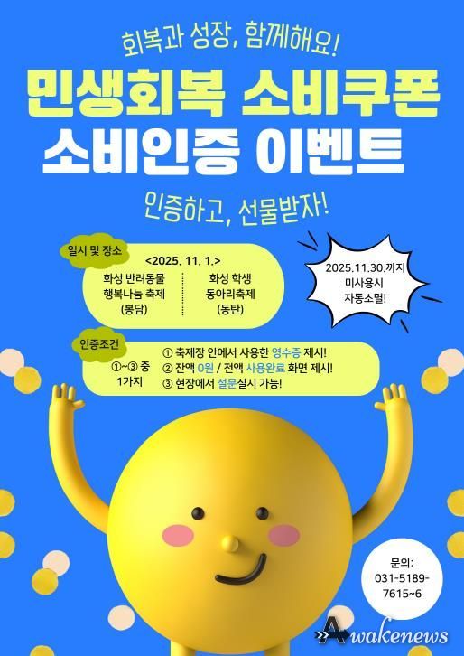어웨이크뉴스 오경하 기자 | 화성특례시가 다음 달 1일부터 시 주요 축제 현장에서 지역 소비를 촉진하고 민생경제 회복에 속도를 내기 위한 ‘민생회복 소비쿠폰 소비 인증 이벤트’를 운영한다.