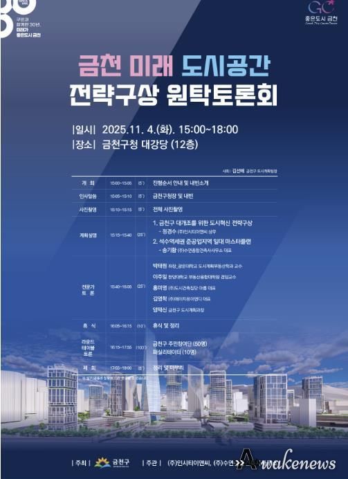 어웨이크뉴스 오경하 기자 | 금천구는 4일 오후 3시 금천구청사 12층 대강당에서 ‘금천의 미래 도시공간 전략구상 계획 수립을 위한 원탁토론회’를 연다고 밝혔다.
