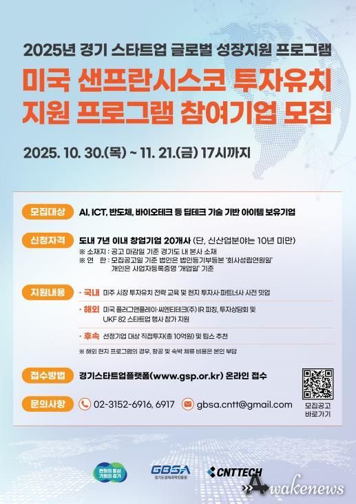 어웨이크뉴스 오경하 기자 | 경기도와 경기도경제과학진흥원은 ‘2025년 경기 스타트업 글로벌 성장지원 샌프란시스코 투자유치 지원 프로그램’에 참여할 기업을 오는 21일까지 모집한다.
