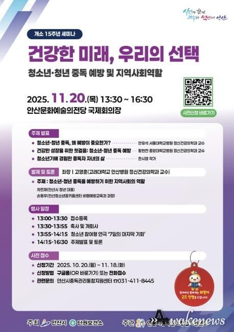 어웨이크뉴스 오경하 기자 | 안산시 중독관리통합지원센터는 오는 20일 안산문화예술의전당 국제회의장에서 개소 15주년을 맞아 ‘건강한 미래, 우리의 선택: 청소년·청년 중독 예방 및 지역사회역할’을 주제로 기념 세미나를 개최한다고 4일 밝혔다.
